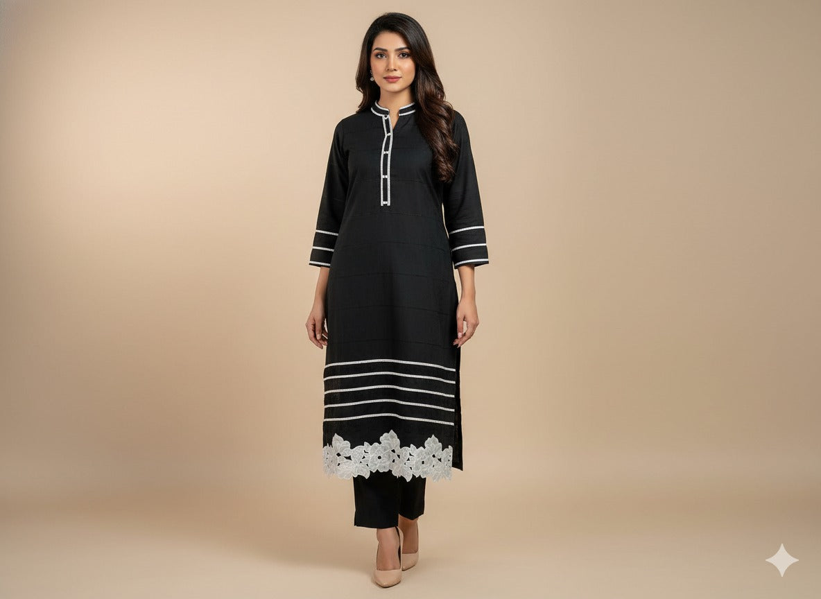 This beautiful black outfit features delicate embroidery on the sleeves and border, enhancing its charm and elegance. The soft wool fabric feels warm and gentle on the skin, giving a perfect drape and all-day comfort. Pair it with heels or khussas for a complete elegant look.